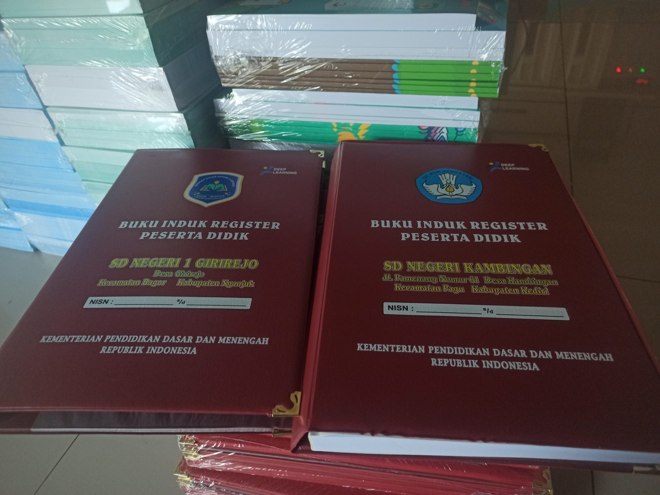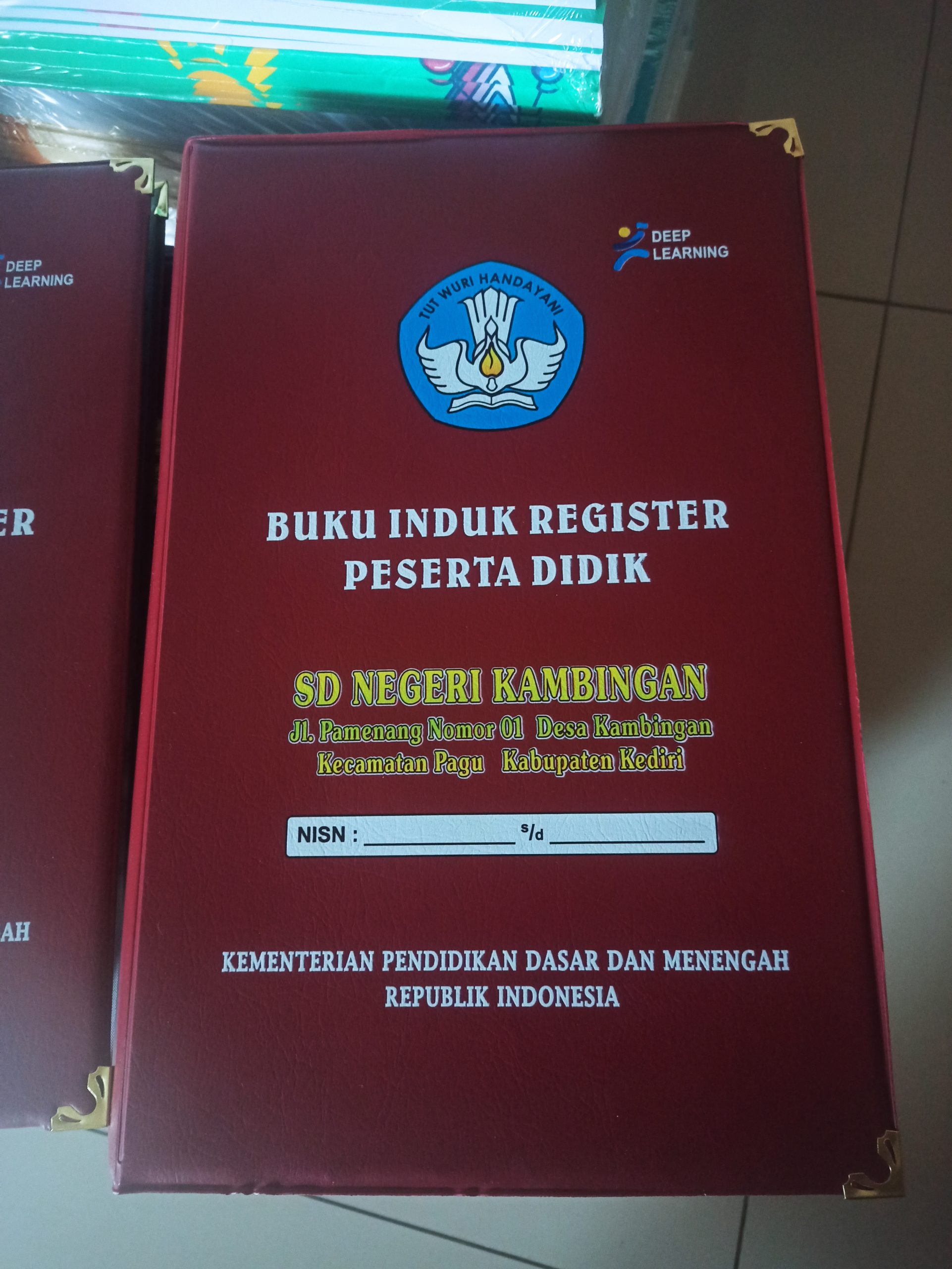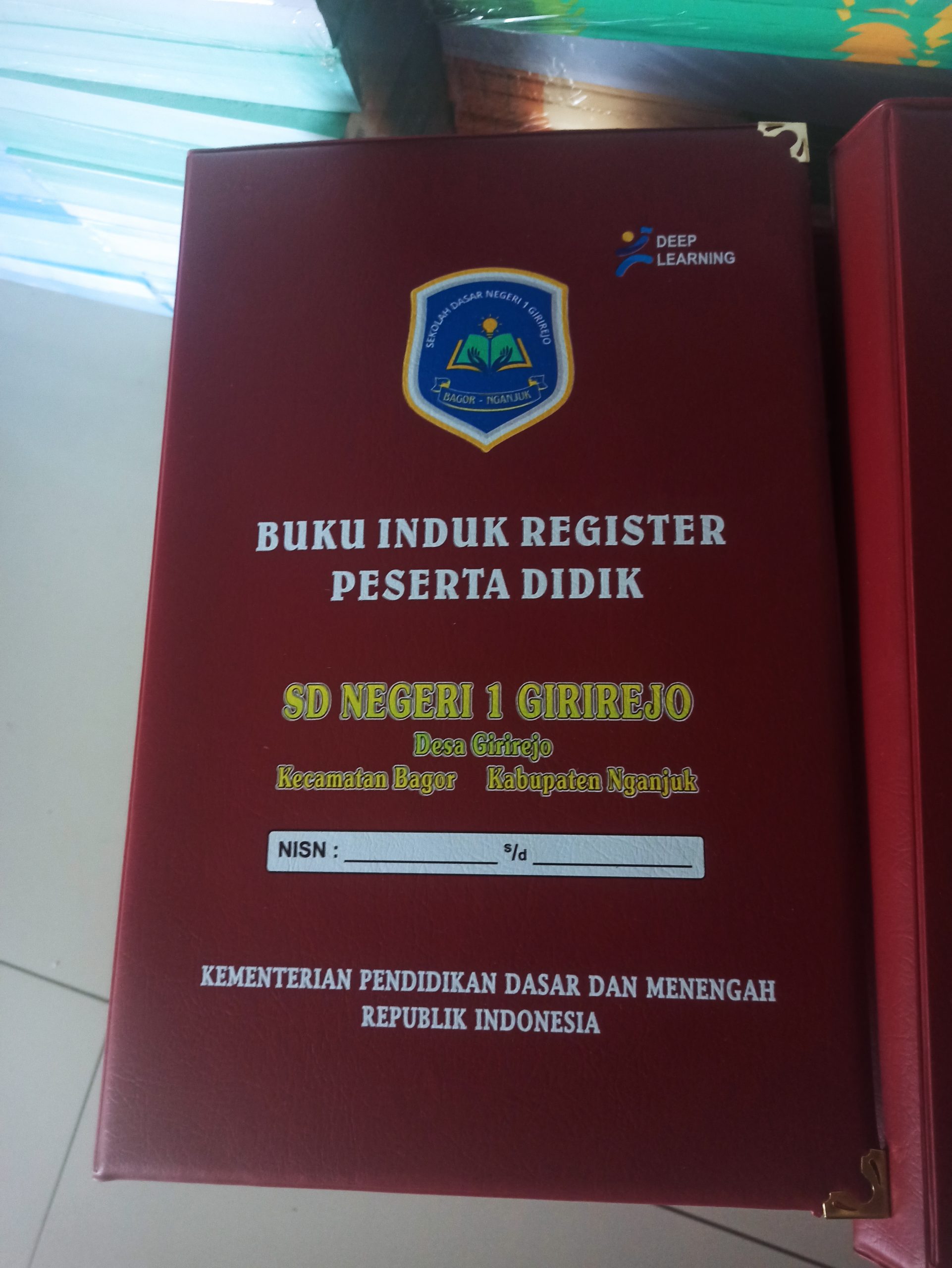 Buku Induk Register Peserta Didik Hard Cover cetak UV area Kediri dan Jawa Timur. Cover tebal lapis kulit sintetis dengan hasil cetak logo dan tulisan menggunakan printer UV yang tajam, awet, dan tidak mudah luntur. Bisa custom nama & alamat sekolah.